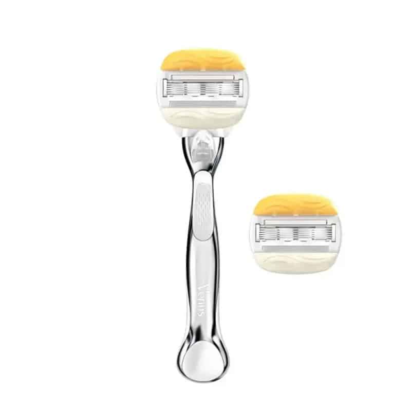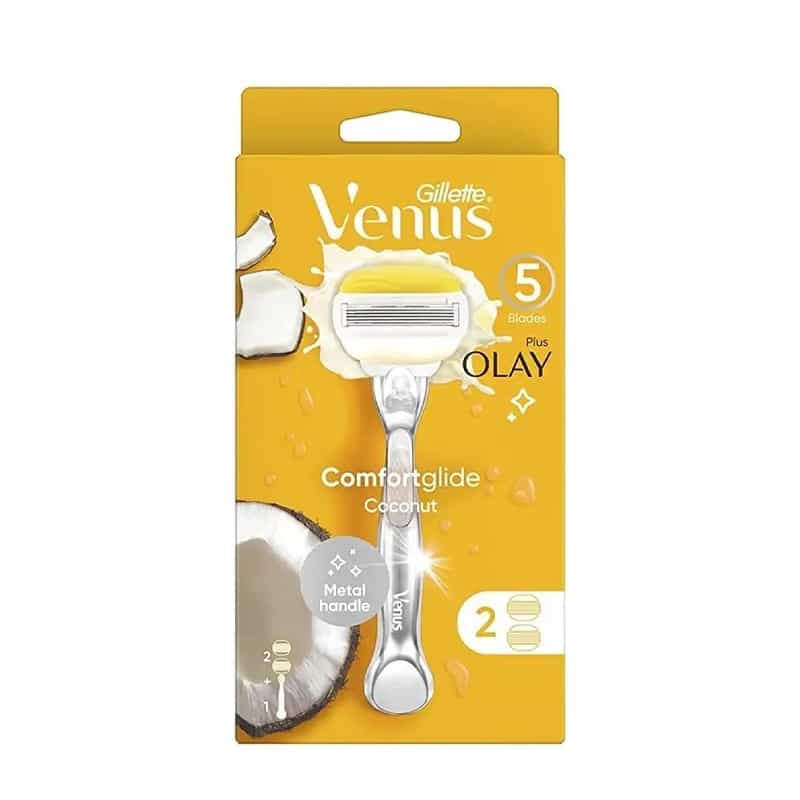 خودتراش ونوس کامفورت گلاید پلاس اولای ژیلت با 5 تیغه؛ مناسب برای خانم ها و دارای نوار ژله ای حاوی روغن نارگیل و ویتامین ای است. که محصولی عالی برای انجام یک اصلاح دقیق و بدون التهاب، قرمزی و سوزش می باشد. این مدل با نوارهای مرطوب کننده اولای و طراحی پیشرفته خود باعث می شود حرکت تیغ روی پوست بسیار روان باشد. پنج تیغه باریک و مقاوم از جنس استیل ضد زنگ به گونه ای طراحی شده اند که با کمترین فشار، موهای بدن را از ریشه جدا کنند. و پوستی کاملا صاف ایجاد کنند. در این بسته یک دسته اصلی و تیغه های یدکی اضافی قرار دارد .که امکان استفاده طولانی مدت و به صرفه را فراهم می کند.